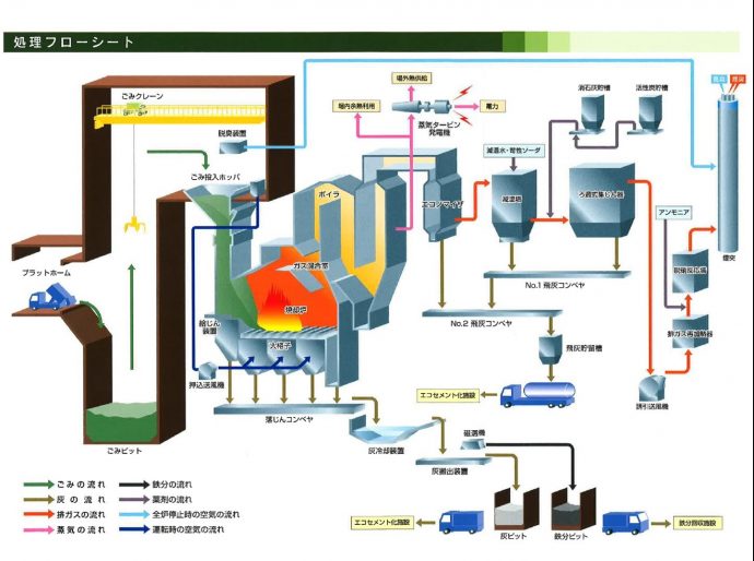 プラットホームからピット投入されたものについては選別作業がないため、プラスチックが混入されていたとしてもそのまま焼却されることになります。におい対策として、負圧を用いる、すなわち、押込送風機と脱臭装置によりプラットホームから焼却炉へ空気を流すことで、臭気を外に漏らさない、といった工夫がなされています。ここでは焼却発電を行なっていますが、得られた電力は、クリーンプラザふじみ・リサイクルセンターと隣接施設(三鷹中央防災公園・元気創造プラザ)への供給を賄った上で、余剰分は電力会社へ売電されます。